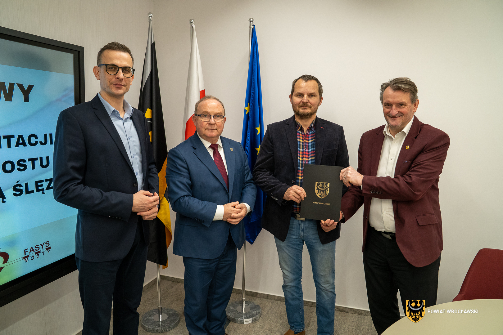 W dzisiejszym spotkaniu w Starostwie Powiatowym, podczas którego sfinalizowano formalności, udział wzięli Starosta Włodzimierz Chlebosz, Wicestarosta Marcin Korytko oraz Urzędujący Członek Zarządu Hieronim Kuryś.